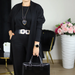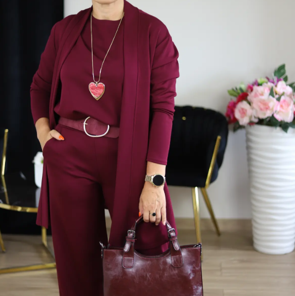 Dette 3-delte cardigan-settet gir deg en komplett look uten stress. Den lange cardiganen kombineres med en matchende topp og bukse som sitter behagelig og ser stilig ut. Perfekt for deg som vil ha et antrekk klart på sekunder, samtidig som du ser gjennomført ut.