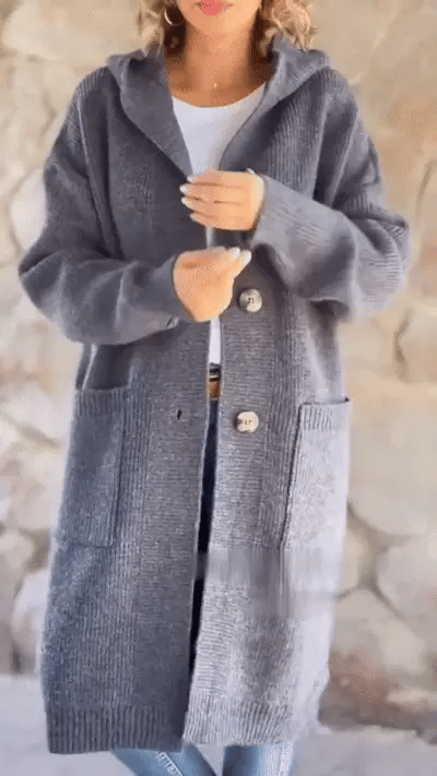 Sofia Strikkejakke med hette gir deg den perfekte kombinasjonen av varme og stil. Den myke strikkestrukturen føles deilig mot huden, og den avslappede passformen gjør den enkel å bruke til både hverdags og kos. Med hette og lommer får du et behagelig og moderne uttrykk – en jakke du faktisk vil bruke hver dag.